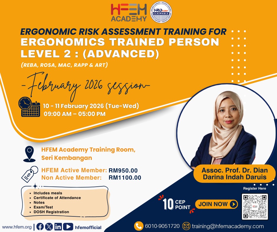 HFEM brings to you a 2-day Initial ERA training for Ergonomics Trained Person (ETP). Our next training session will be conducted by Assoc. Prof. Dr. Dian Darina Indah Daruis
