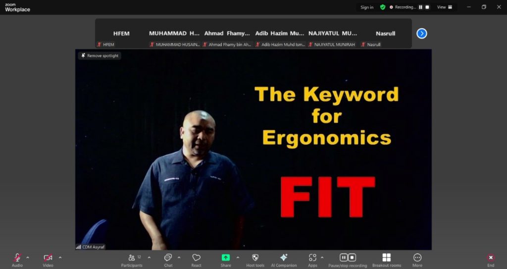 HFEM Academy successfully conducted a public online training through Zoom Meeting on Writing Inclusive and Comprehensive Ergonomic Risk Assessment (ERA) Report on 20 August 2025, facilitated by Ts. Asyraf Che Doi. The session equipped participants with practical knowledge and structured approaches to ensure ERA reports are thorough, inclusive, and aligned with professional standards. This training not only enhanced participants’ reporting skills but also strengthened their ability to contribute effectively to workplace ergonomics management.