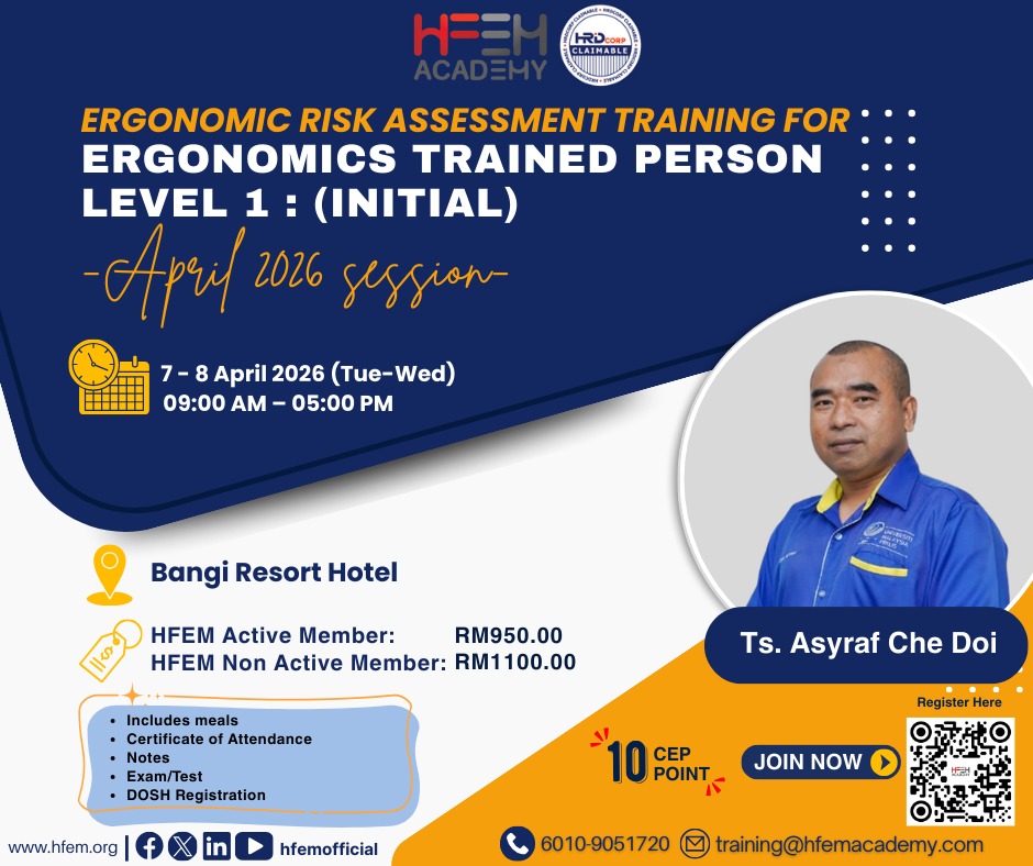 HFEM established a stringent requirement for anyone to be recognized as a HFEM ETP trainer. Most of our ETP trainers are a member of Technical Committee for DOSH Guidelines for Ergonomics Risk Assessment at Workplace (2017).